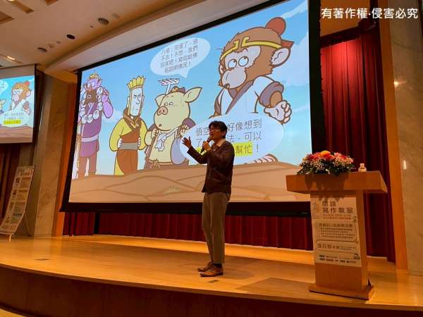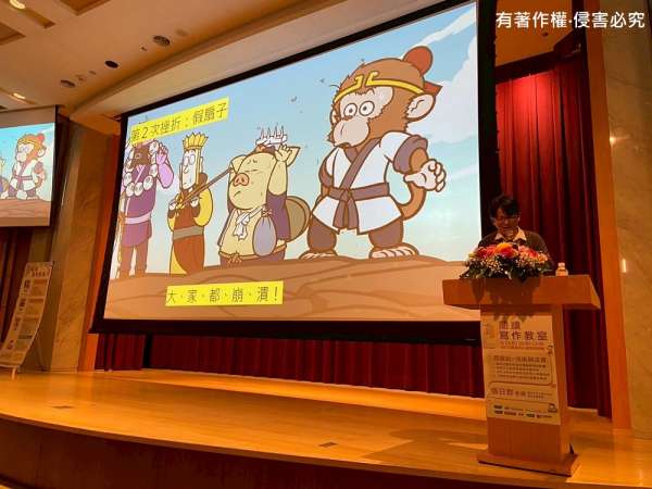 首先,張老師以一款取材自孫悟空形象的電玩遊戲作為開始。他介紹道:「遊戲主角為花果山靈明石猴,法寶有如意金箍棒,法術則有分身術、定身術。」老師一說明完,現場聽眾立刻心領神會,這款遊戲的設計靈感,正是來自中國四大名著之一的《西遊記》。這段別出心裁的開場,不僅喚醒大家對經典故事的熟悉記憶,也激發了對傳統文化與現代創意相互激盪的期待與好奇。